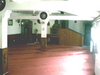 Der Raum ist mit dickem Teppichboden ausgelegt, Ornamentteppiche mit Schriftzgen darauf an den Wnden, am Kopfende eine Art Kanzel, links davon ein stilisiertes