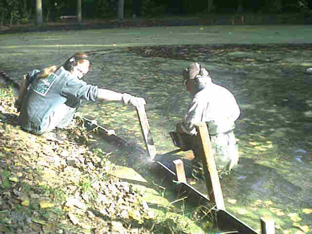 "Meer muss dran jluve" sagte sich so mancher Grengeler, als er am 20 September den Artikel "Bald knnen die Frsche wieder quaken- Mllteiche werden entrmpelt" im Klner Express lasen. Keiner glaubte so recht daran, dass sich die eher als behbig geltende Klner Verwaltung, den Senkelteichen wirklich annehmen wrden. Um so erstaunter war man, als am Dienstag den 16. Oktober Fahrzeuge der Landschafts- und Wasserbaufirma Sieg+ Partner anrckten. Die alten, noch zu Stadt- Porzer- Zeiten eingerammten Holzpalisaden wurden entfernt, und durch eine neue Einfassung ersetzt. "Na, sehr fachgerecht ist die Arbeit der  Wasserbauer im Auftrag der ehemaligen Stadt Porz nicht gewesen", sagt  Bauleiter Martin Kotthaus  von Sieg+ Partner und weist auf diverse Fundstcke hin. "Da hat man doch tatschlich gespaltene Bahnschwellen eingesetzt. Das Material ist recht giftig, vor allem fr Frsche, kein Wunder, dass in diesem Teich nicht viel gelebt hat."