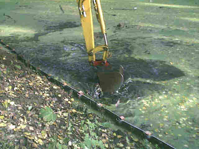 Hier wird "im Trben gefischt" ein Bagger fllt die Rinne zwischen Ufer und Beplankung mit Senkelschlamm aus.